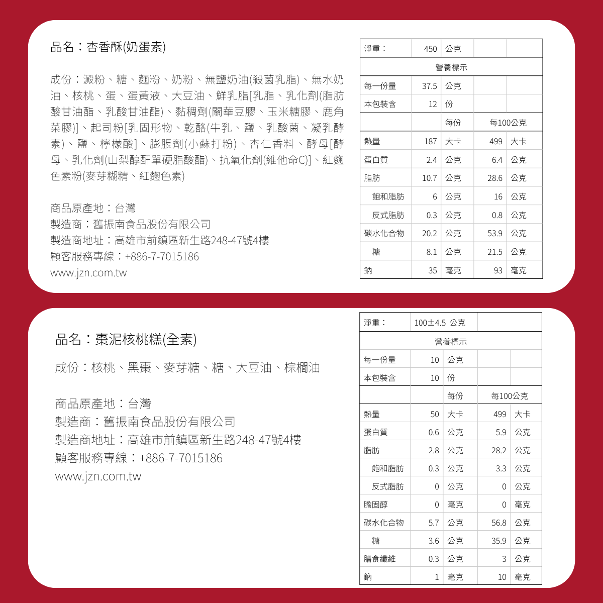 ● 棗泥核桃(奶蛋素):純正黑棗脫皮去籽,加州核桃經烘烤香氣濃郁。