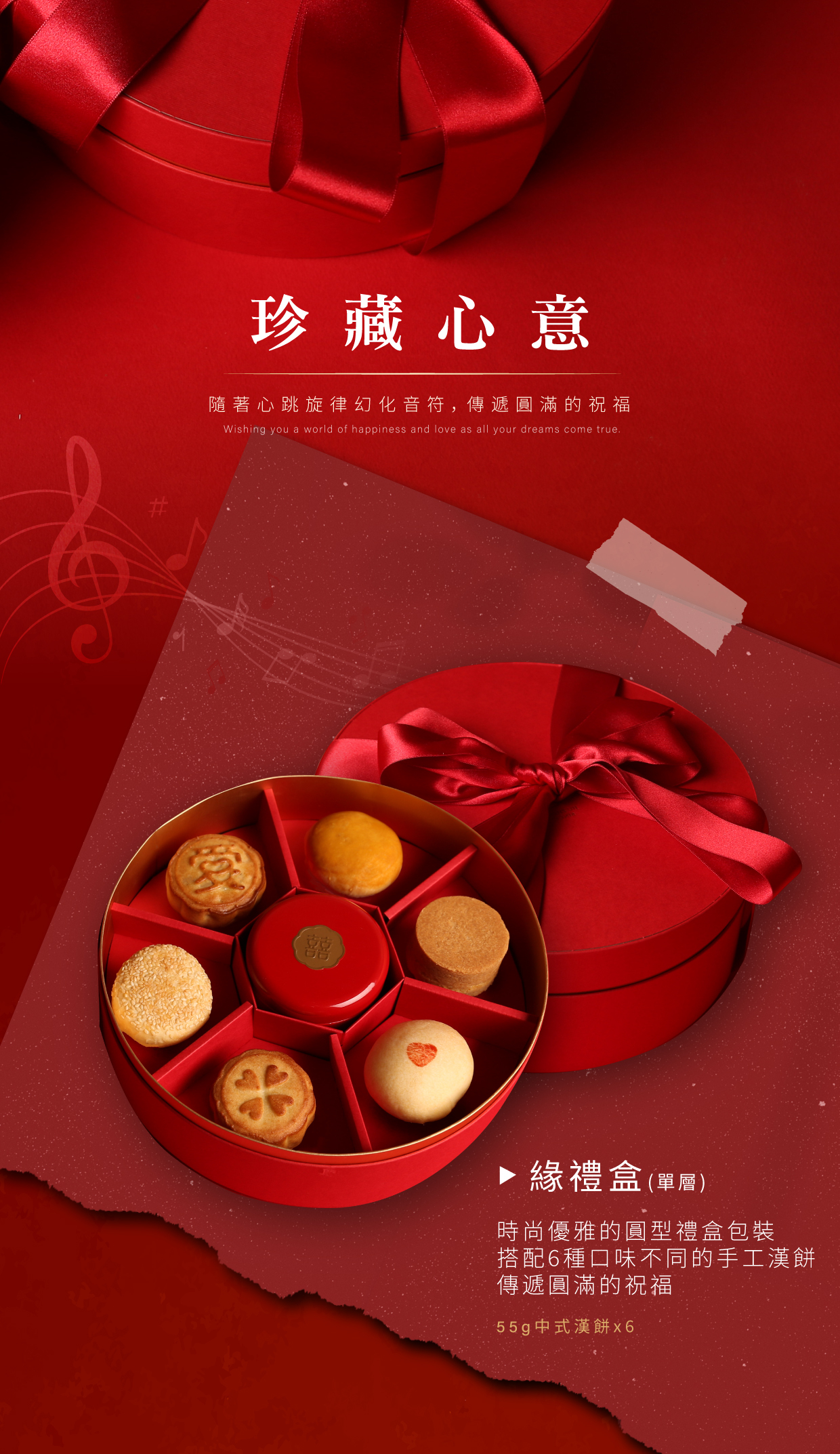 舊振南經典緣禮盒以大紅時尚優雅的圓型禮盒包裝,加上人工手打的蝴蝶結更顯優雅與高質感,口味豐富、禮盒美觀吸睛。小圓餅搭配棗泥核桃糕糖盒,具有豐富層次,六顆小圓餅是緣禮盒特別限定的口味、樣式,從包裝到漢餅都是圓形,所以有圓滿的含意,每一塊圓弧都是珍藏心意,隨著心跳旋律幻化音符分裝入盒,多重滋味,傳遞圓滿的祝福、有圓滿的含意,很適合用於提親使用。