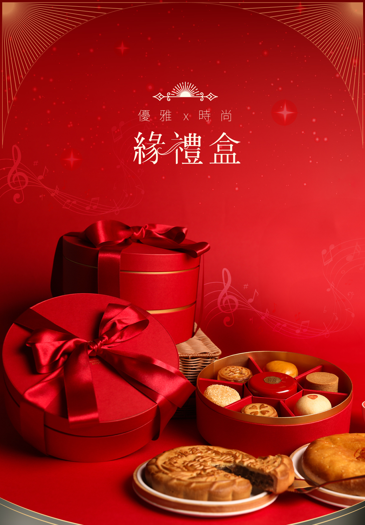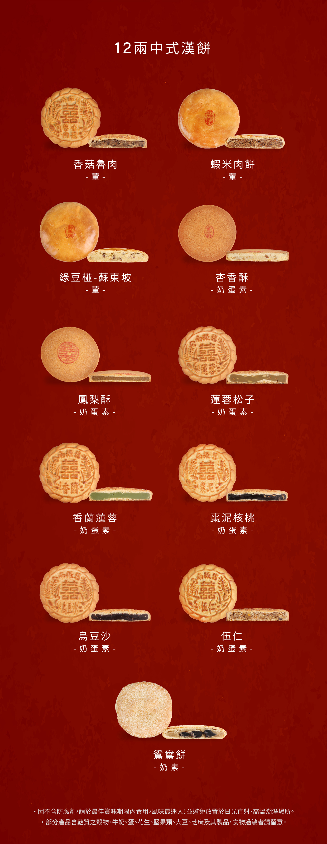 香菇魯肉(葷)、綠豆椪-李白(奶素)、杏香酥(奶蛋素)、香蘭蓮蓉(奶蛋素)、鴛鴦餅(奶素)、豆沙Q餅(奶蛋素)、棗泥核桃糕糖盒