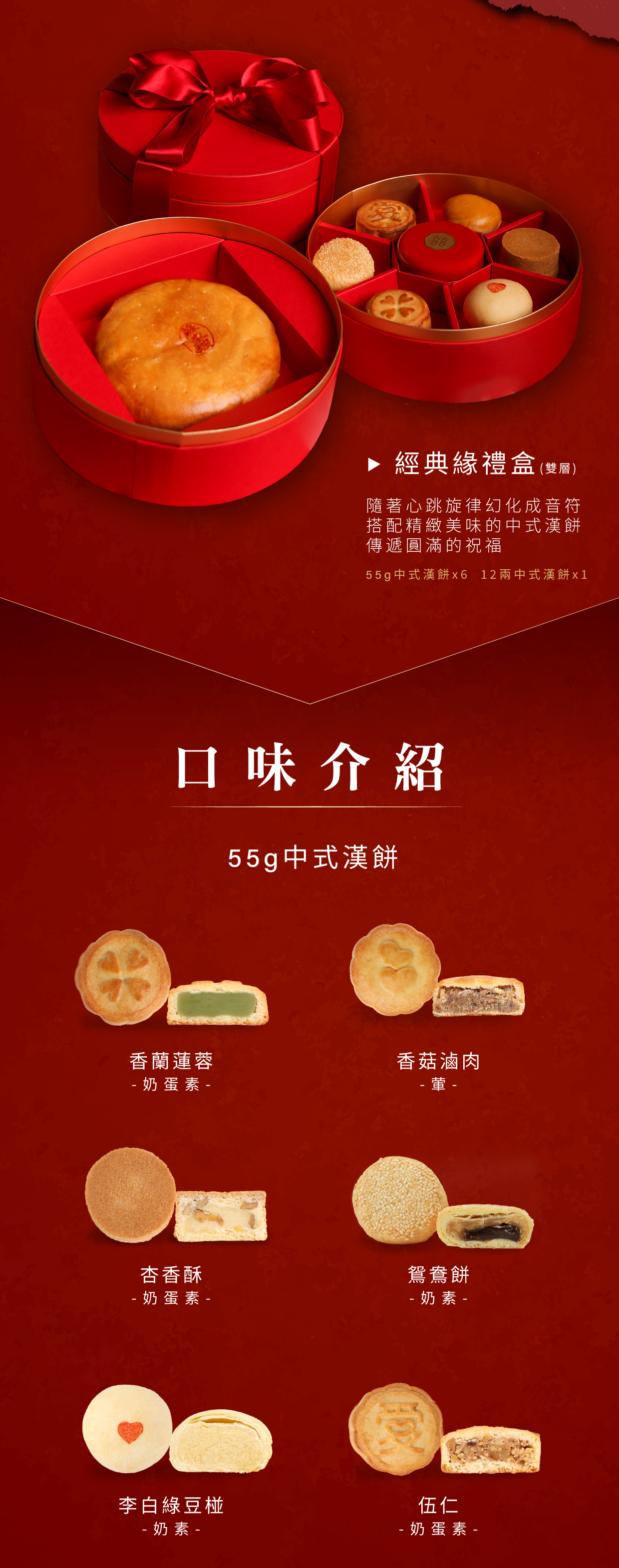 伍仁(奶蛋素)、綠豆椪-李白(奶素)、杏香酥(奶蛋素)、香蘭蓮蓉(奶蛋素)、鴛鴦餅(奶素)、豆沙Q餅(奶蛋素)、棗泥核桃糕糖盒