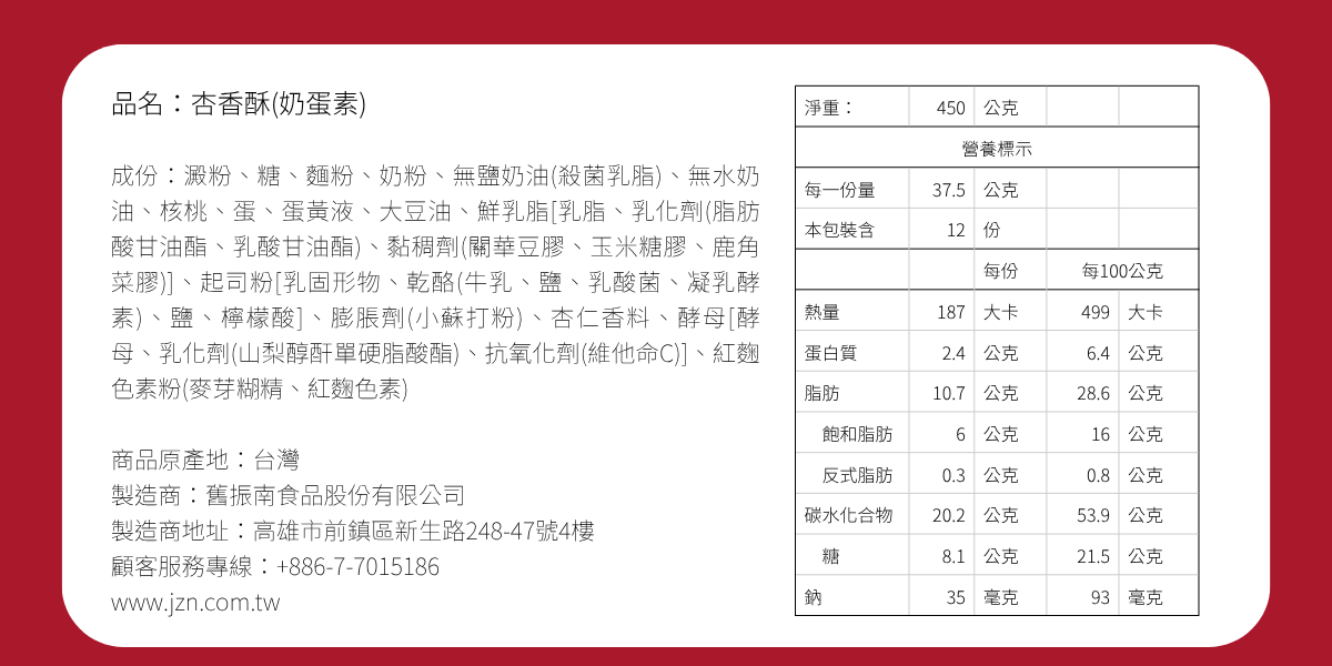 ● 杏香酥(奶蛋素)《雙潔淨標章認證》:滿滿杏仁清朗香氣,濃郁核桃回甘風味,兩者一見鍾情。