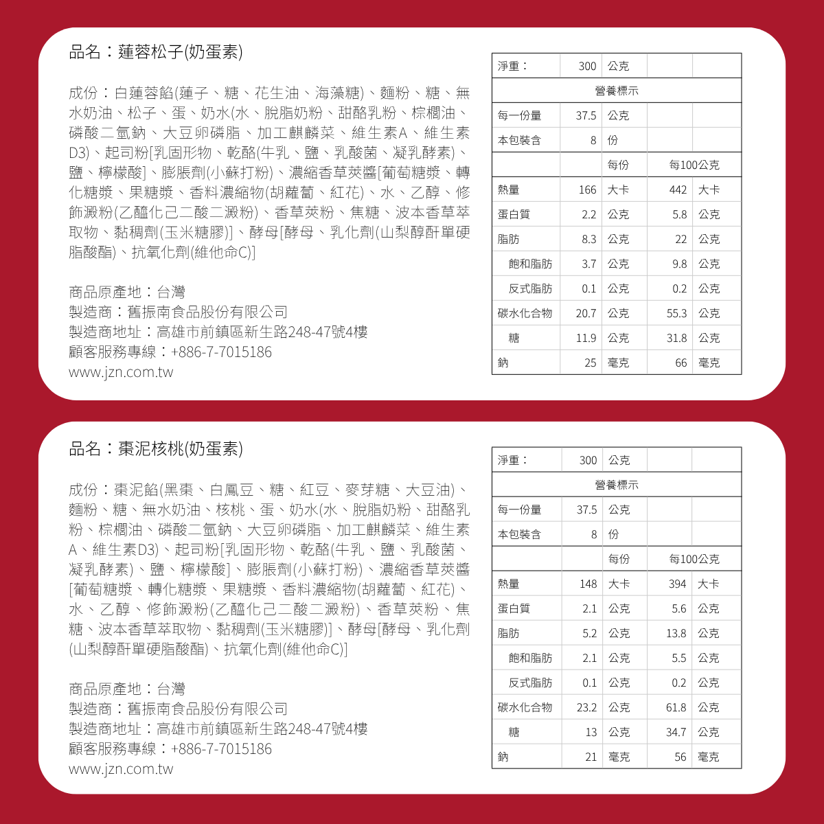● 棗泥核桃(奶蛋素):純正黑棗脫皮去籽,加州核桃經烘烤香氣濃郁。