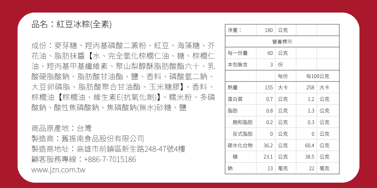 • 紅豆冰粽 (全素) x 3 顆:嚴選台灣在地紅豆細火慢熬,保留紅豆綿密口感,搭配晶透Q彈的冰粽外皮,入口冰涼滑順。