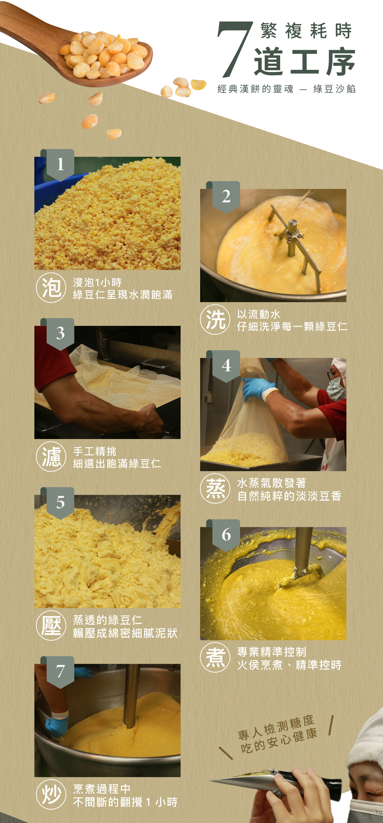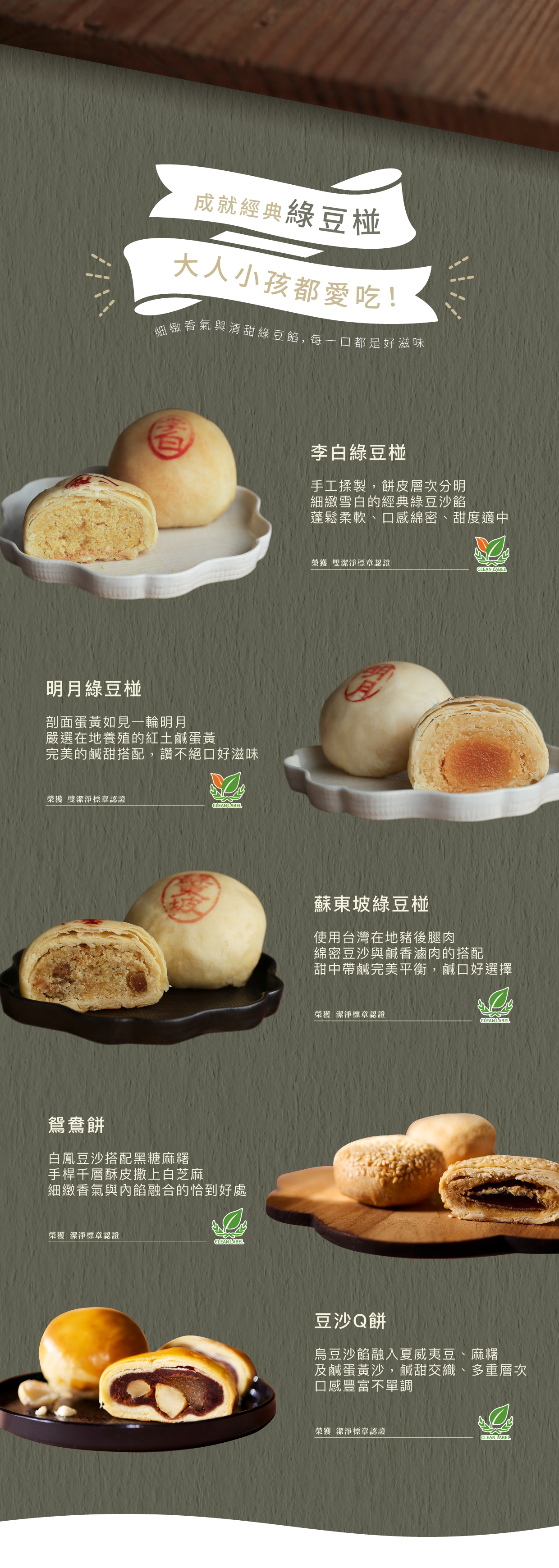 ● Mung Bean Pastry (Salted Egg Yolk) (Lacto-Ovo Vegetarian):Jiu Zhen Nan's signature Taiwanese Mung Bean Pastry has a light aroma and melt-in-your-mouth texture. Crafted using a traditional seven-step baking method, the fluffy mung bean filling is encased in layers of hand-rolled pastry. A popular gift choice, it embodies our culinary excellence.