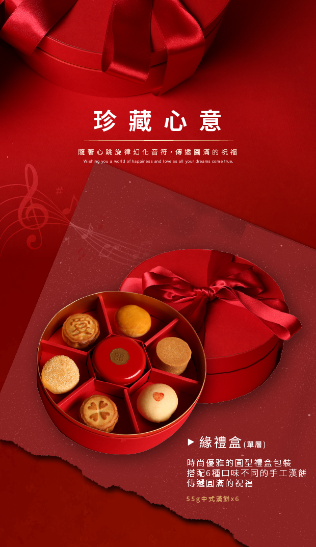 Stylish and refined, this luxurious circular gift box in rich red is adorned with a hand-tied bow, adding an extra touch of elegance. Featuring six limited-edition round biscuits, specially crafted for the Full-Circle Gift Box, paired with a dessert case of jujube walnut candy. The circular design of both the packaging and pastries symbolizes the idea of "full circle," to be cherished alongside wedded bliss and every loving wish. This set is also an ideal choice for a marriage proposal gift.