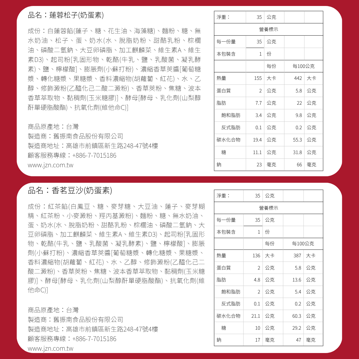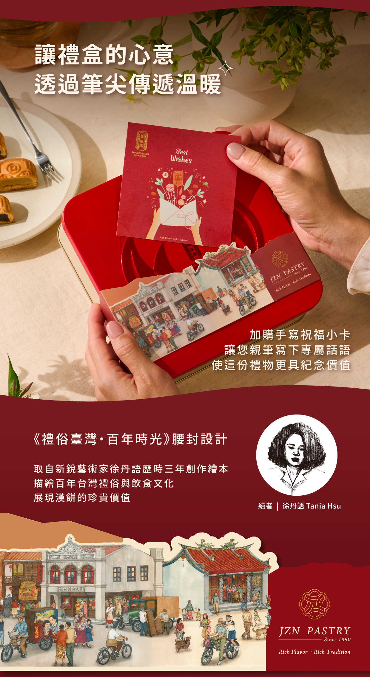 貼近現代人的生活習慣,將8兩漢餅縮小成「迷你漢餅設計」,品嚐變得更輕鬆愜意,一口即是開心好時光!經典紅金配色,傳遞喜慶與尊貴,主色調採用舊振南代表性的喜慶紅,並以金色點綴禮盒細節;盒型中四瓣圓形紋樣寓意圓滿和諧的美好時光,四瓣代表親情、友情、愛情、緣分,切合生活中的每一個重要時刻。適用於多元場合,豐厚的文化深度與品味,讓傳遞心意更顯得宜。