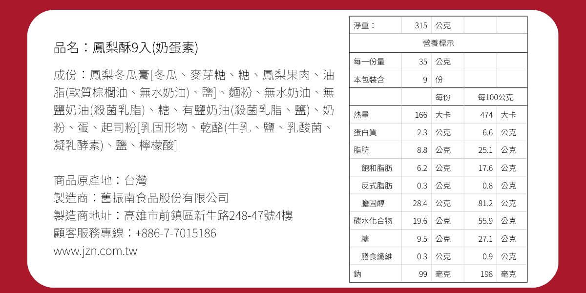 嚴選日照充足的台農17號金鑽鳳梨為底,在入餡前充分研磨細桿鳳梨纖維,混合冬瓜醬做為內餡,滑順綿密香甜可口。外層酥皮使用高品質雞蛋與新鮮奶油拌入,再加上獨家配方乳酪粉,由專業師傅精準掌控溫度與時間,烤出外酥鬆又帶有濃郁奶香,內餡保留恰到好處的濕潤口感。獲得比利時世界食品品鑑大賞銀獎認證,為全年熱賣台灣指定伴手禮。