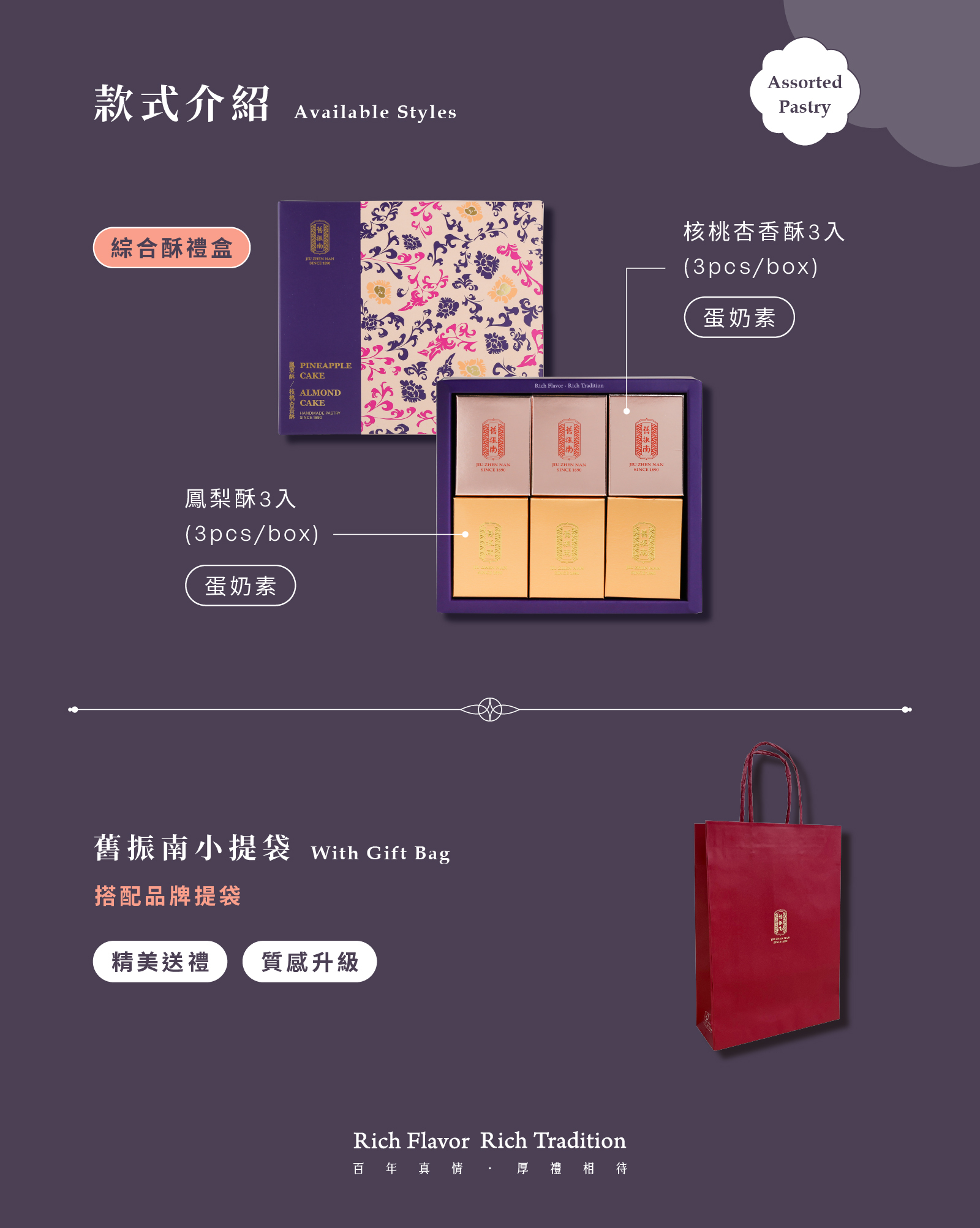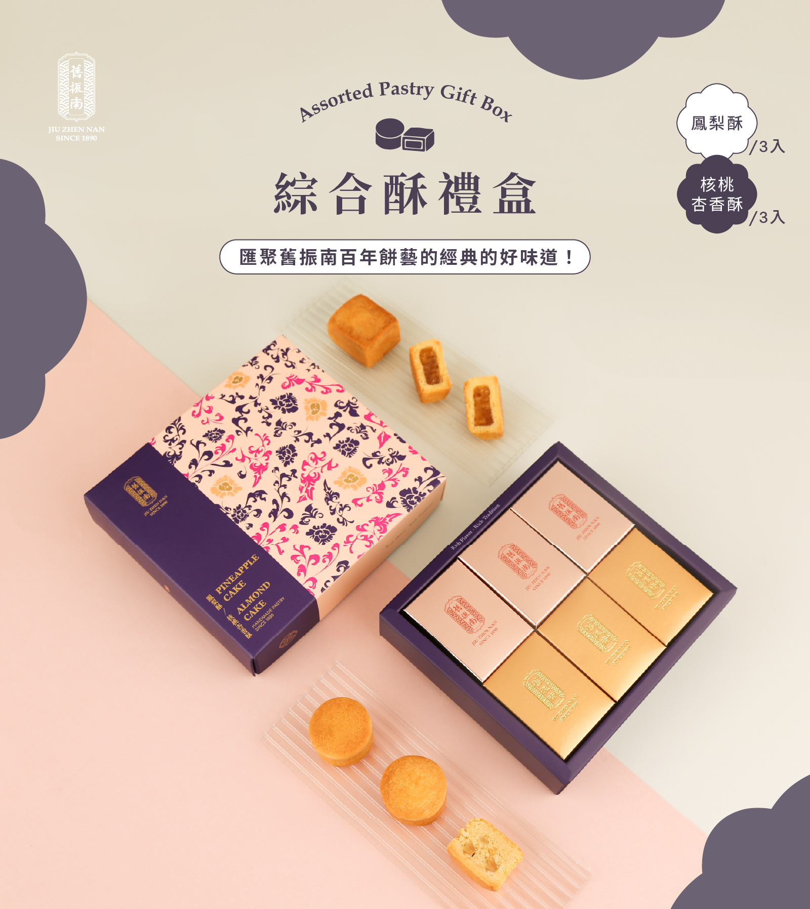 舊振南餅店創始於西元1890年(清光緒16年),傳承百年手工製餅技藝,將漢餅精神價值,演繹在送禮哲學上,讓每一份舊振南禮品,都能觸動送禮者與收禮者的內心,舊振南,將台灣味道與在地特色推廣到世界各地。身為見證歲月流轉的百年品牌,無論是伴手禮、節慶禮盒,或精緻的中式喜餅,皆能感受到舊振南漢式糕點文化精神的重視。近年來以精緻的烘焙體驗課程與有趣的禮俗活動,將台灣文化記憶,感染更多海內外朋友,引領一個更為重視禮數的生活品味。