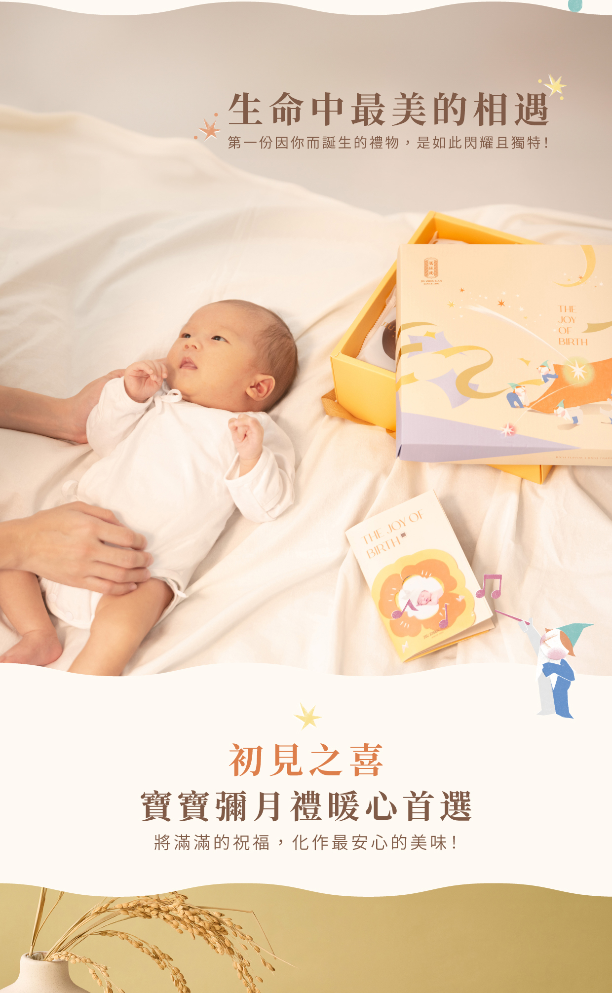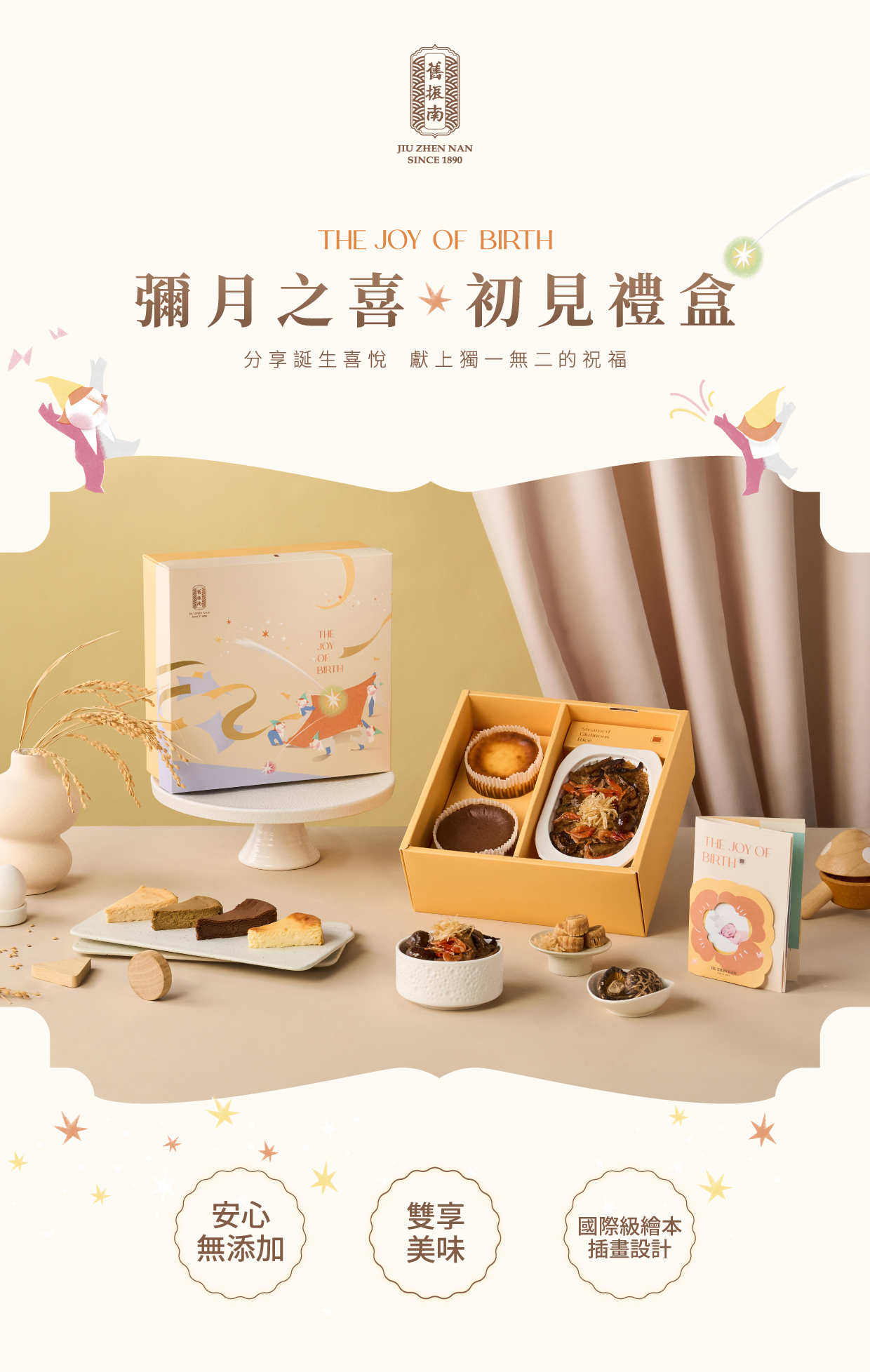 寶寶的第一聲啼哭、第一次微笑、第一次緊握您的手……每一個瞬間,都是愛的奇蹟,也是最無可取代的珍貴記憶。舊振南誠摯推出 「彌月之喜—初見禮盒」,將這份新生的喜悅化作一場細膩動人的藝術饗宴。舊振南邀請國際級波隆那世界插畫大獎入圍繪本藝術家,以溫暖筆觸與柔和色調,描繪生命初見的美好故事,細膩訴說父母心中滿溢的愛與感動。訂製獨一無二的繪本故事,為寶寶誕生的瞬間留下專屬印記,讓這份初見的悸動,化為一輩子的珍藏。