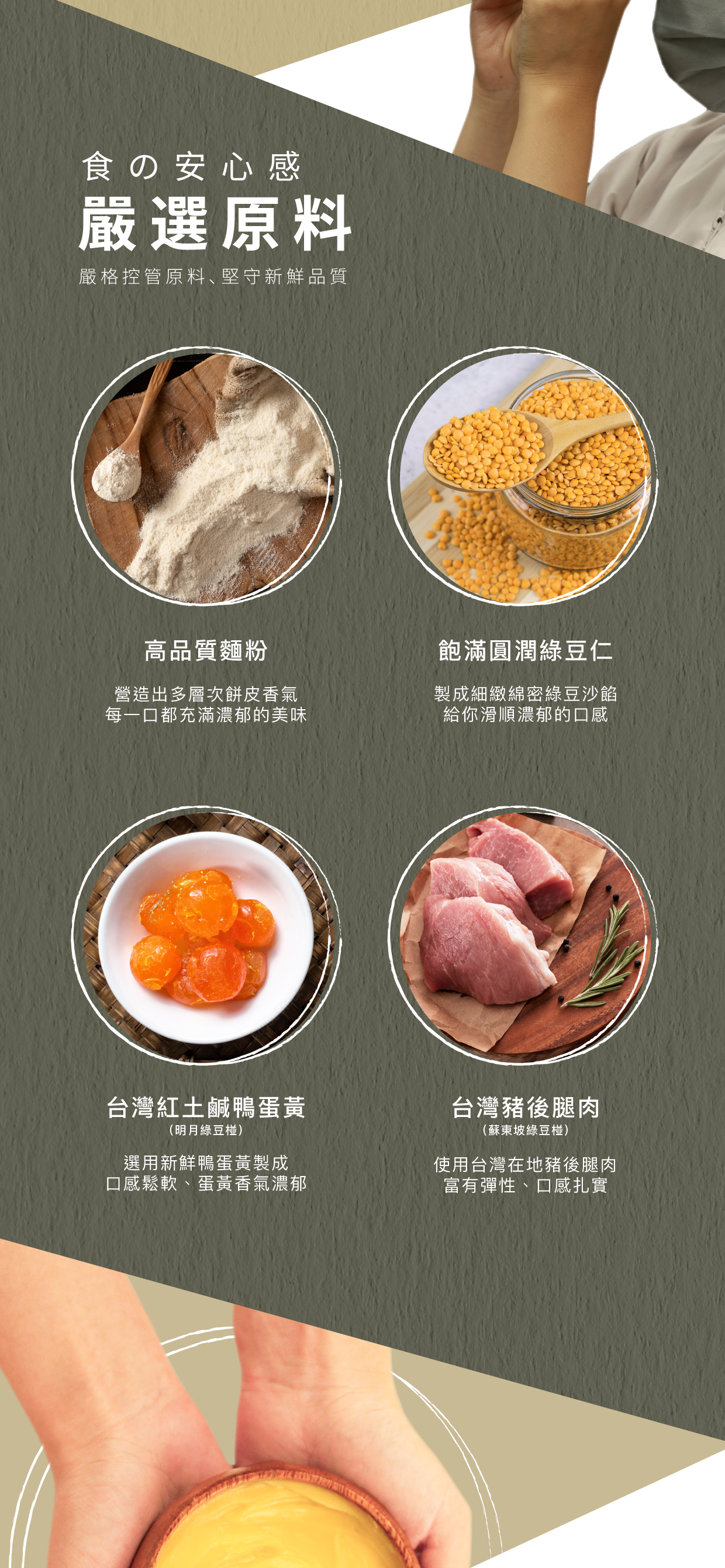 綿密清香綠豆沙餡,加上採用台灣屏東在地養殖的鴨蛋製成鹹蛋黃,切開後色澤有如一輪明月,鹹蛋黃口感與綠豆沙完美結合,是讓大家讚不絕口的好滋味。