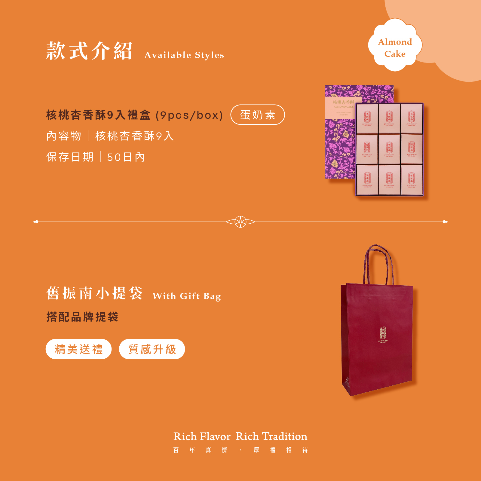 舊振南甜品暢銷品項,只要品嘗過就會愛上!清新脫俗、回甘的溫潤滋味。就像高級香水一般,紮實飽滿的金色酥皮,是舊振南核桃杏香酥的精緻外型,濃郁奶香是它的前段香氣,酥皮採用天然無水奶油,由老師傅的巧手慢火烘烤。咬一口,優雅的杏仁香滿溢口中與鼻息,是它的中段香氣。當齒頰碰上核桃時,堅果的滋味增添令人驚艷的層次變化,並中和了杏仁過分的風采,是杏香酥給你的最後一個驚喜。