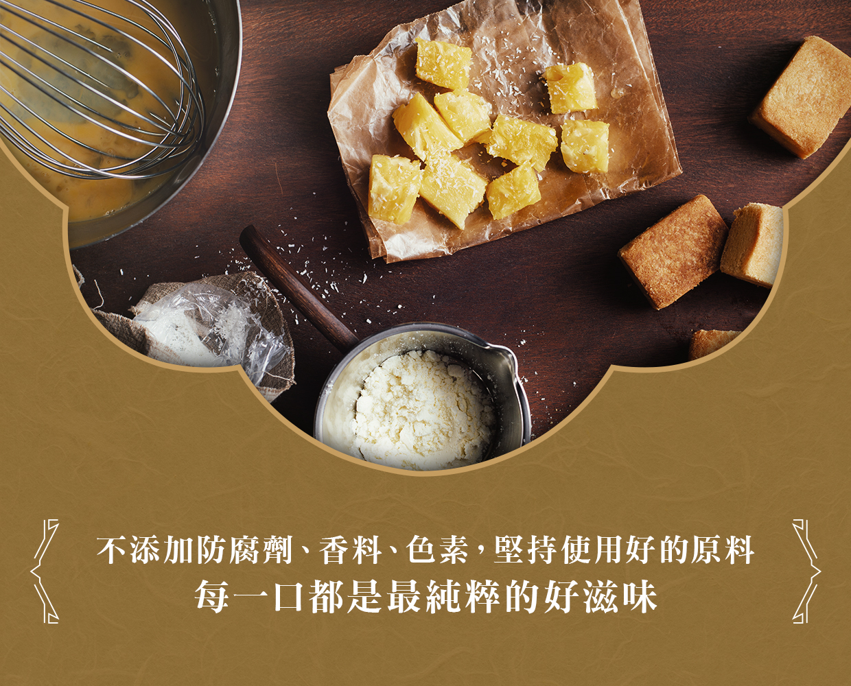 嚴選日照充足的台農17號金鑽鳳梨為底,在入餡前充分研磨細桿鳳梨纖維,混合冬瓜醬做為內餡,滑順綿密香甜可口。外層酥皮使用高品質雞蛋與新鮮奶油拌入,再加上獨家配方乳酪粉,烤出外酥鬆又帶有濃郁奶香,內餡保留恰到好處的濕潤口感。獲得比利時世界食品品鑑大賞銀獎認證,為全年熱賣台灣指定伴手禮。