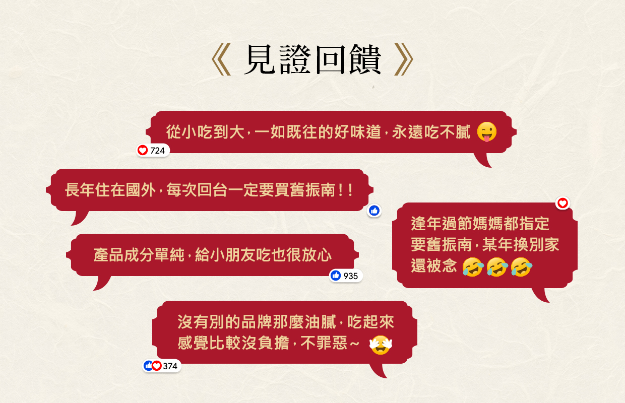 舊振南餅店創始於西元1890年(清光緒16年),傳承百年手工製餅技藝,將漢餅精神價值,演繹在送禮哲學上,讓每一份舊振南禮品,都能觸動送禮者與收禮者的內心,舊振南,將台灣味道與在地特色推廣到世界各地。身為見證歲月流轉的百年品牌,無論是伴手禮、節慶禮盒,或精緻的中式喜餅,皆能感受到舊振南漢式糕點文化精神的重視。近年來已經至的烘焙體驗課程與有趣的禮俗活動,將台灣文化記憶,感染更多海內外朋友,引領一個更為重視禮數的生活品味。