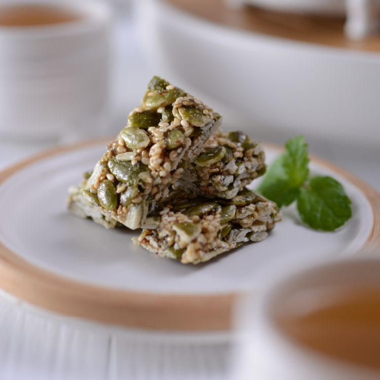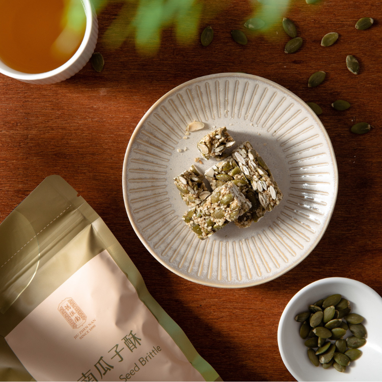 南瓜子酥是將嚴選實飽滿南瓜子翻炒至熟後,撒入後味香醇的白芝麻,並淋上甜而不膩的精質麥芽,南瓜子清香紮實飽滿,口感酥脆不黏牙,為品茗必備小品。