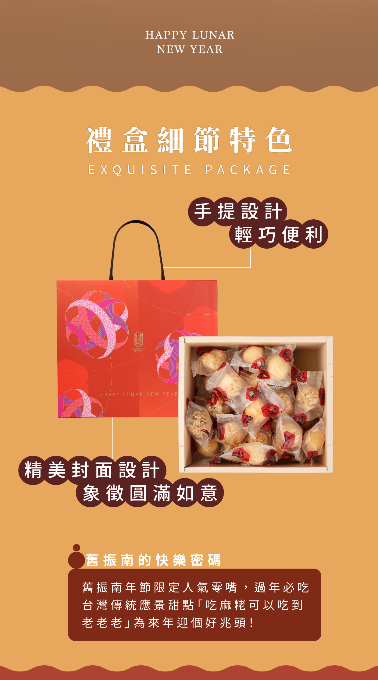 舊振南年節限定人氣零嘴,過年必吃台灣傳統應景甜點,「吃麻粩可以吃到老老老」為來年迎個好兆頭。