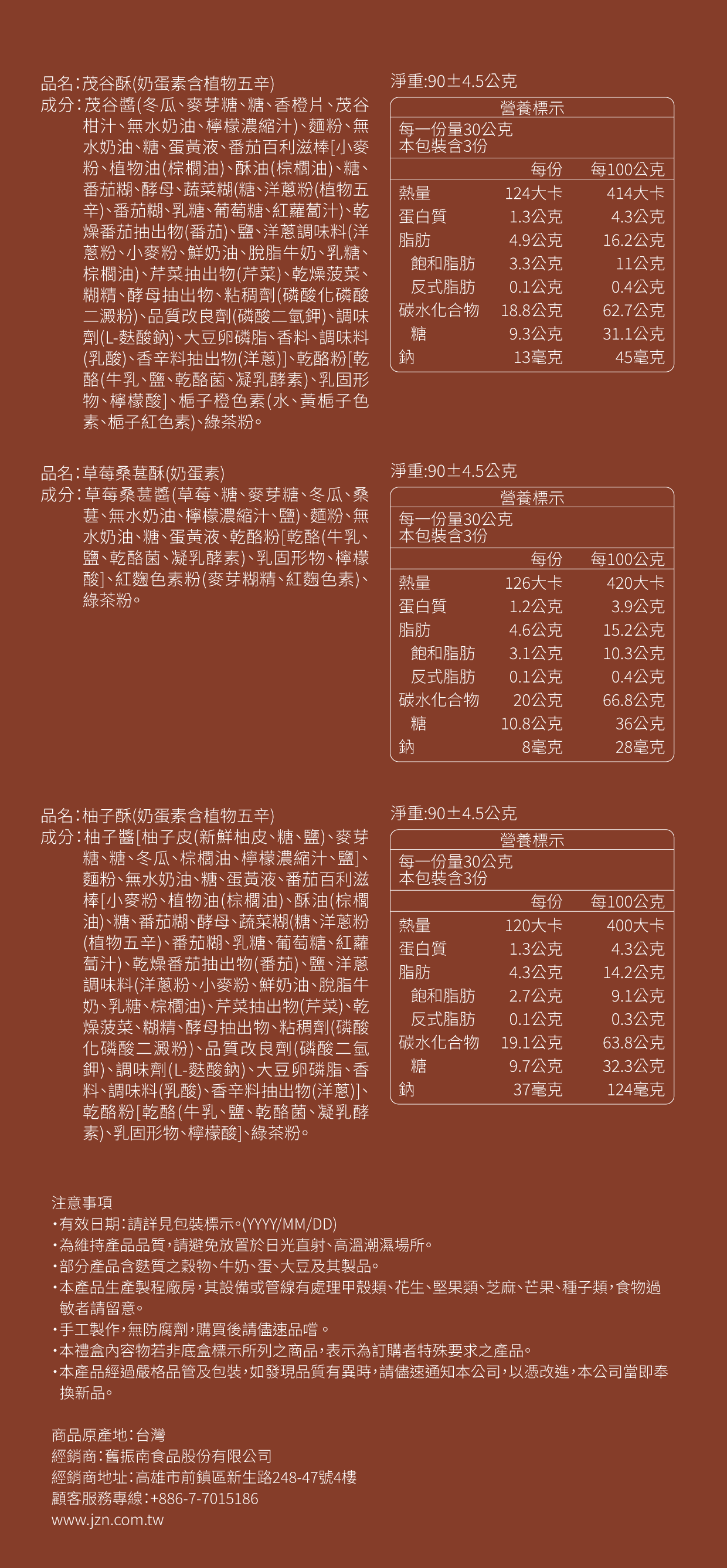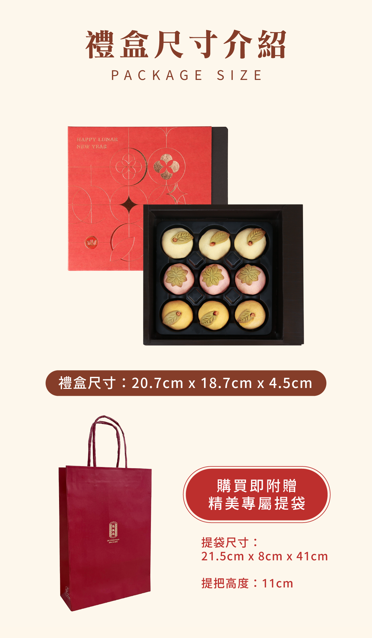 柚子酥(奶蛋素-含植物五辛)3入+草莓桑葚酥(奶蛋素)3入+茂谷酥(奶蛋素-含植物五辛)3入+春節禮盒專屬提袋(1只)。