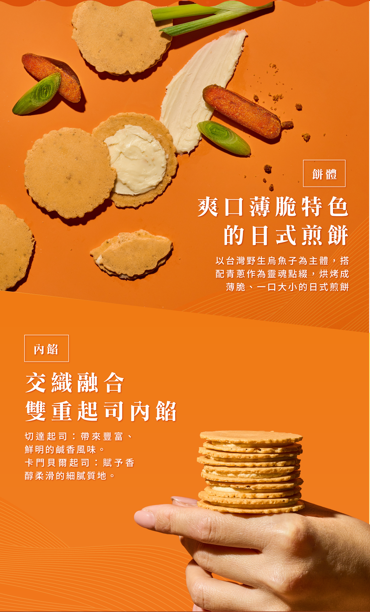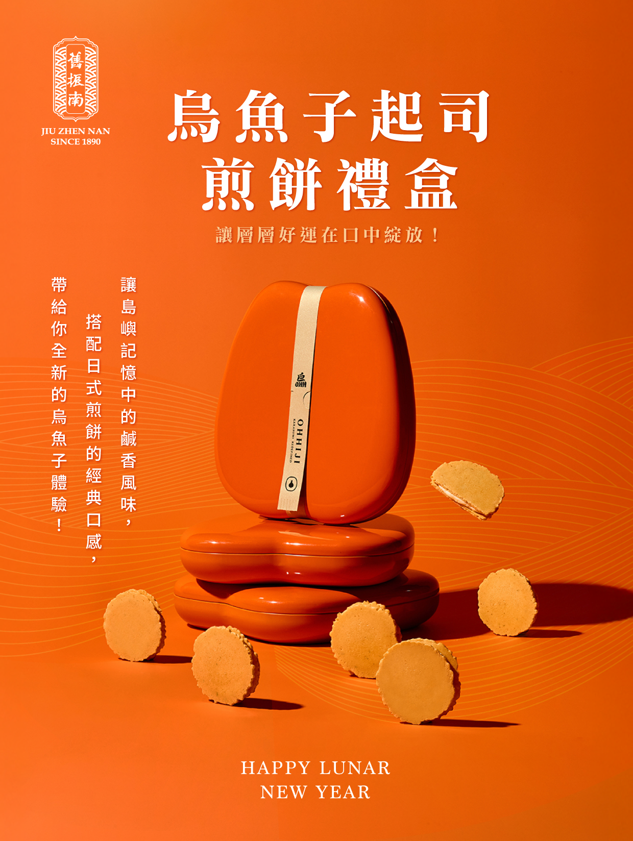 春節團聚品烏魚子,寓意「多子多孫多福」。舊振南嚴選台灣野生烏魚子,揉合青蔥香氣,與日本職人攜手研發薄脆日式煎餅,咬下瞬間迸發「PARIPARI(パリパリ)」的酥脆聲響,兩片煎餅間,藏著柔滑濃郁的切達與卡門貝爾起司,雙重起司餡平衡烏魚子的鮮香,更寓意財富圓滿、福運相隨。讓層層好運在口中綻放!