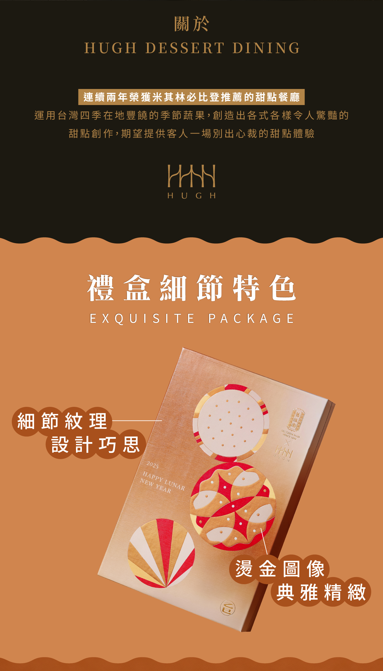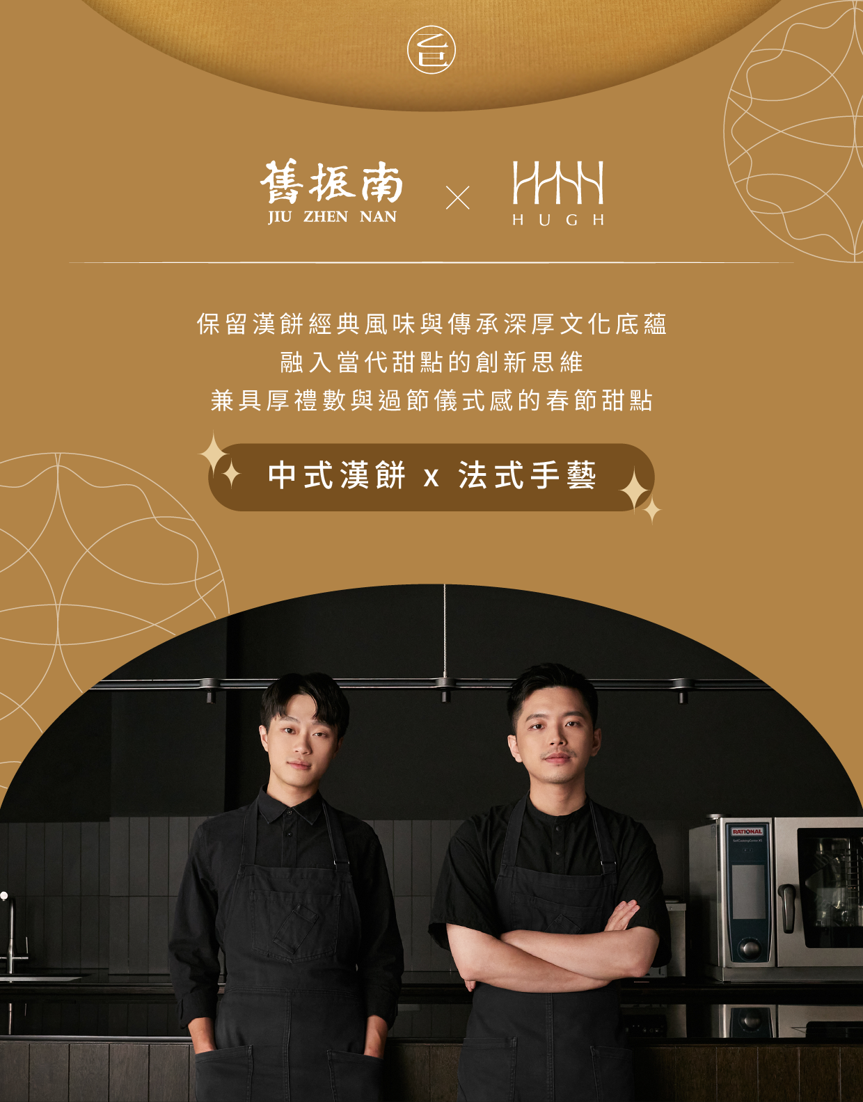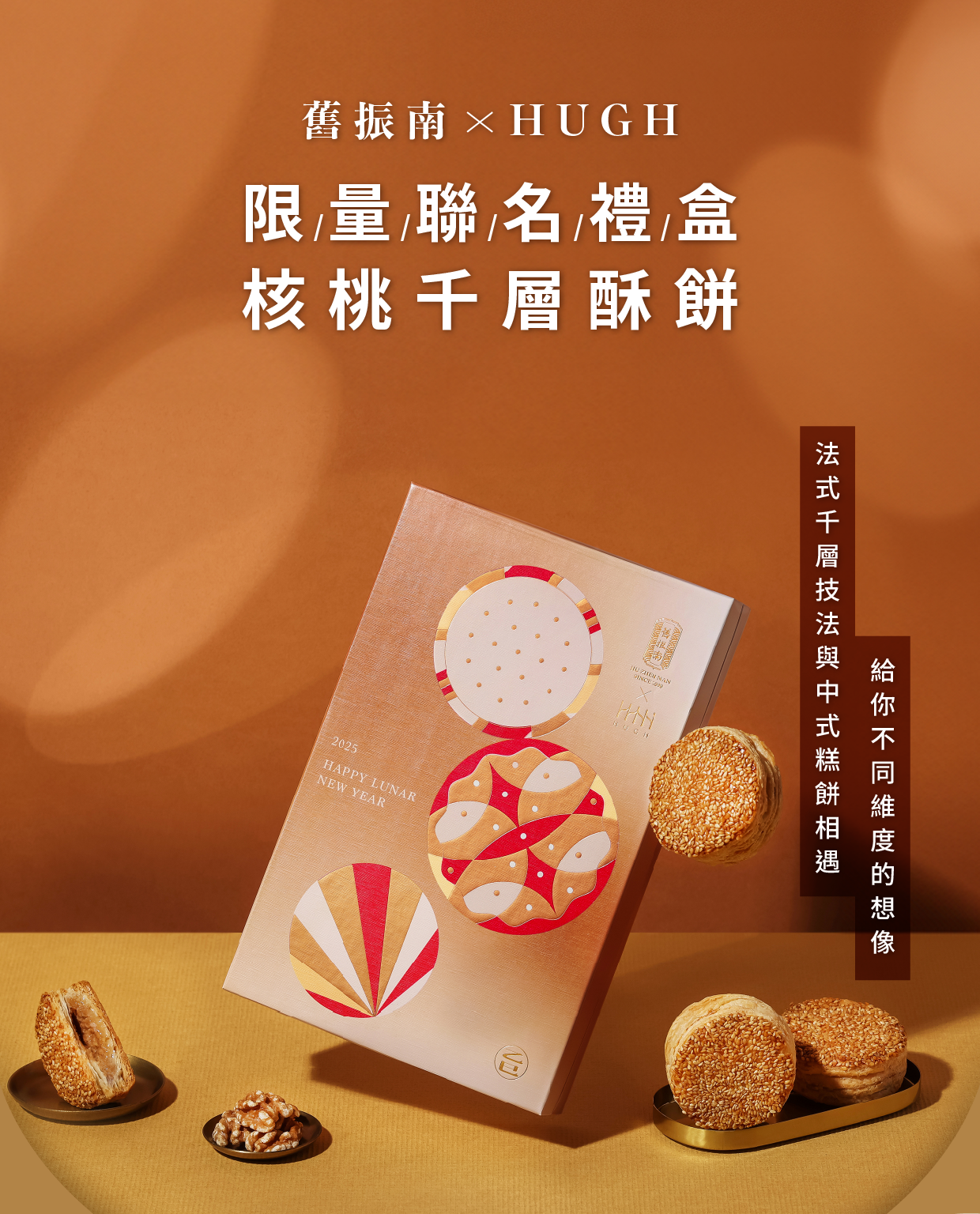 舊振南攜手HUGH dessert dining推出春節聯名限定,結合兩大品牌願景和理念,在保留漢餅經典風味與傳承深厚的文化底蘊之際,融入當代甜點的創新思維,構築對於新年嶄新的祝福與願景,帶入現代人過節生活儀式,打造兼具厚禮數與品牌核心價值的春節甜點。