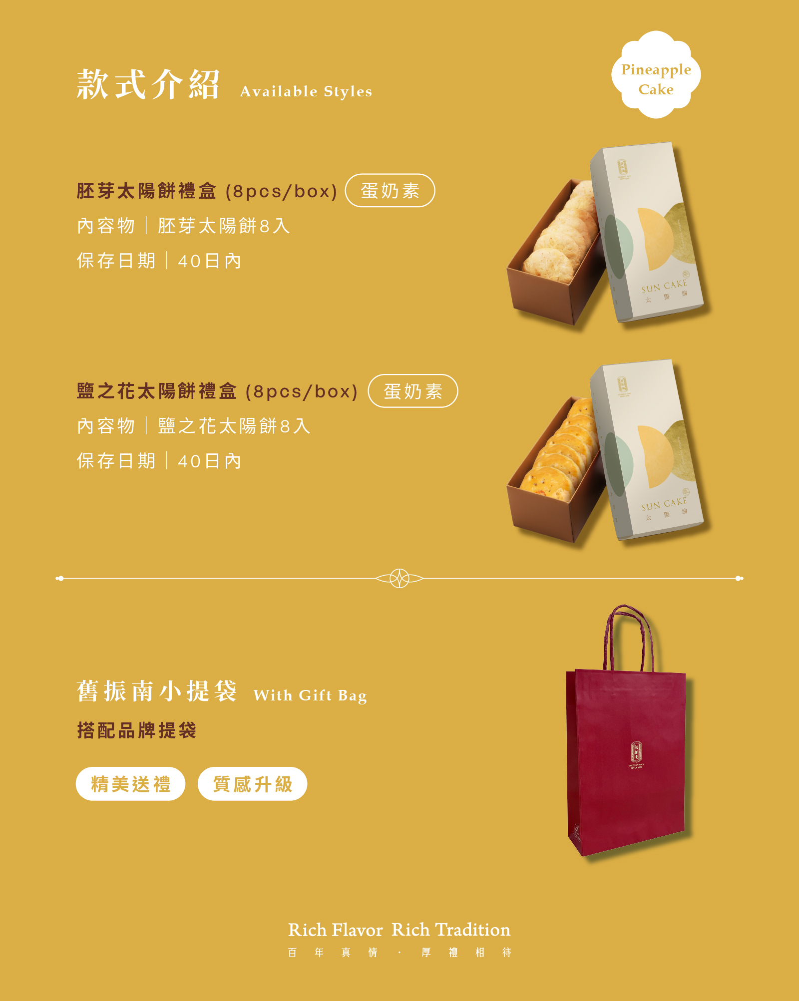 太陽餅又稱為「麥芽酥餅」,是將傳統酥餅中的餡心改為以麥芽糖及奶油為主的糖餡演變而來,而舊振南與其他市售太陽餅的差別呢,就是我們的餅皮還特別灑上了含有豐富維他命E及蛋白質的小麥胚芽粉,因此嚐起來有淡淡的胚芽香。外皮的麵糰揉得厚薄適中,內餡則是奶香濃郁,吃起來不黏牙也不膩口的奶油麥芽內餡,外皮與內餡呈現完美比例,每咬一口,都是藏不住的美味,然後會需要有強烈的意志力來制止再吃一片的渴望!與坊間太陽餅不同,舊振南的餅皮很薄透,還灑上健康的小麥胚芽粉,吃完一個絕對還會想吃第二片。