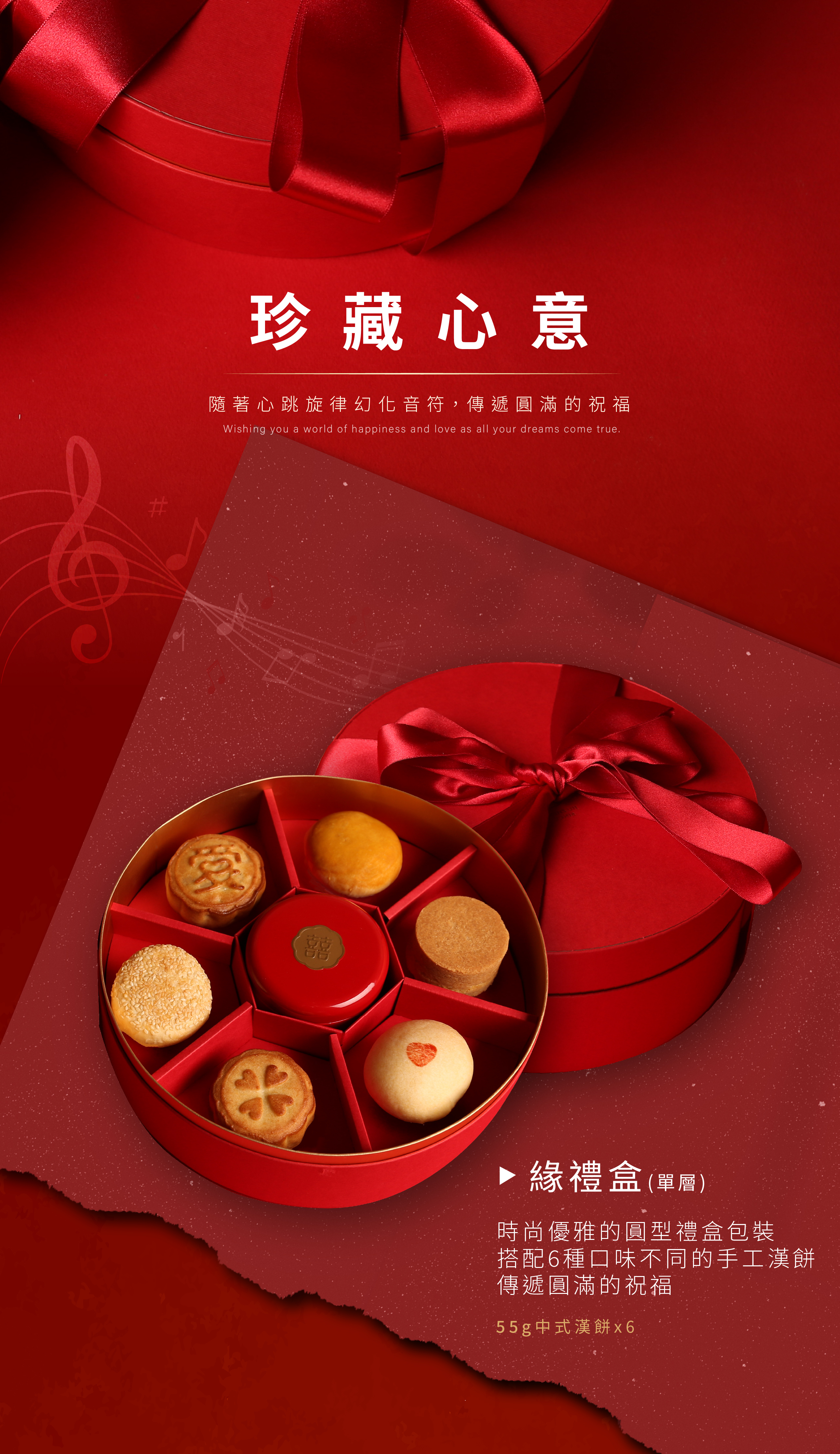 Stylish and refined, this luxurious circular gift box in rich red is adorned with a hand-tied bow, adding an extra touch of elegance. Featuring six limited-edition round biscuits, specially crafted for the Full-Circle Gift Box, paired with a dessert case of jujube walnut candy. The circular design of both the packaging and pastries symbolizes the idea of "full circle," to be cherished alongside wedded bliss and every loving wish. This set is also an ideal choice for a marriage proposal gift.