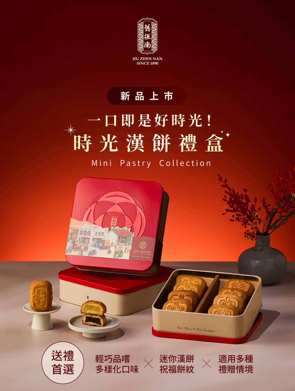 贴近现代人的生活习惯,将8两汉饼缩小成「迷你汉饼设计」,品嚐变得更轻松惬意,一口即是开心好时光!经典红金配色,传递喜庆与尊贵,主色调采用旧振南代表性的喜庆红,并以金色点缀礼盒细节;盒型中四瓣圆形纹样寓意圆满和谐的美好时光,四瓣代表亲情、友情、爱情、缘分,切合生活中的每一个重要时刻。适用于多元场合,丰厚的文化深度与品味,让传递心意更显得宜。