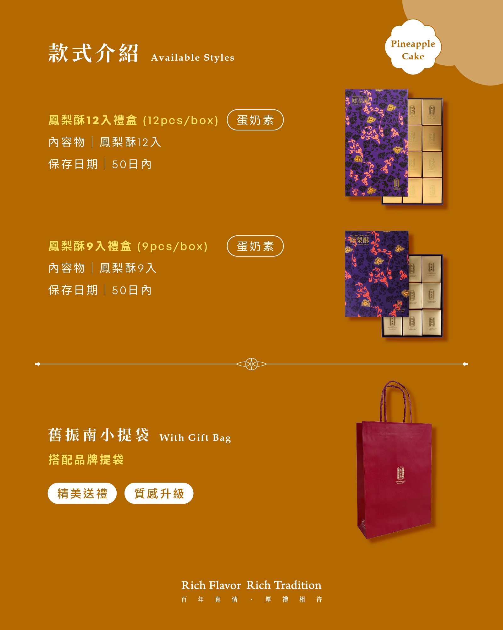 严选日照充足的台农17号金鑽凤梨为底,在入馅前充分研磨细杆凤梨纤维,混合冬瓜酱做为内馅,滑顺绵密香甜可口。外层酥皮使用高品质鸡蛋与新鲜奶油拌入,再加上独家配方乳酪粉,由专业师傅精准掌控温度与时间,烤出外酥松又带有浓郁奶香,内馅保留恰到好处的湿润口感。获得比利时世界食品品鑑大赏银奖认证,为全年热卖台湾指定伴手礼。