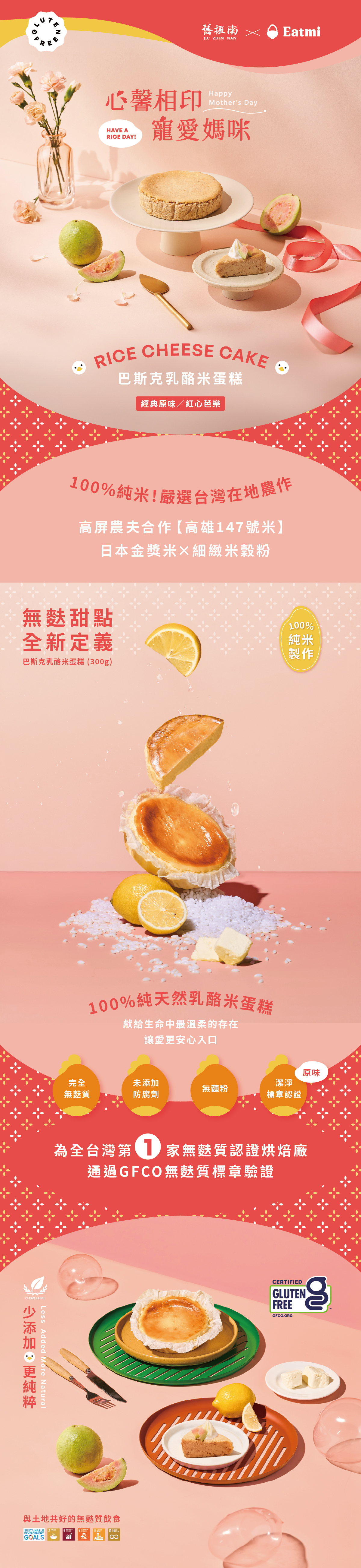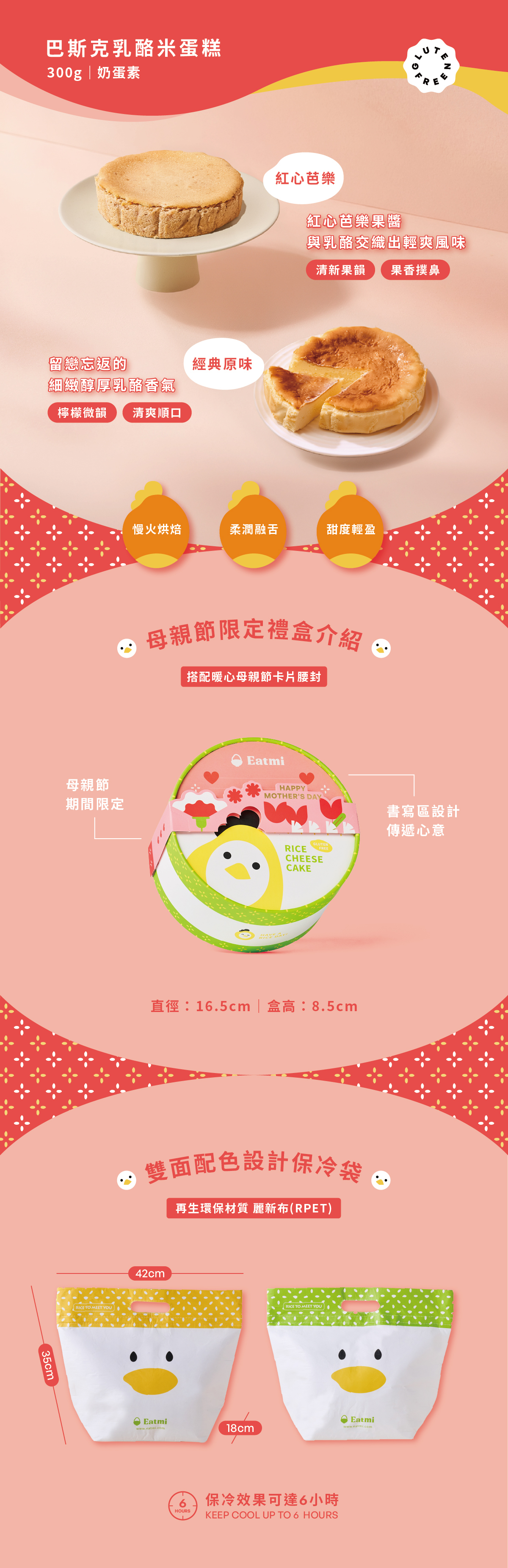 附贈母親節卡片腰封,寫下溫馨小語,傳遞滿滿心意與祝福。選用日本金獎高雄147號蓬萊米製成,採用紅心芭樂果醬與乳酪交織出輕爽風味。圓形精緻造型減少材積與紙材的使用,搭配回收寶特瓶再製的環保保冷袋,取代一次性材質,同時延長保冷保鮮時效,展現舊振南對永續的承諾。無論是獻給母親、與家人共享,或是為自己留一份寵愛,都能細細感受米蛋糕的柔滑細緻。